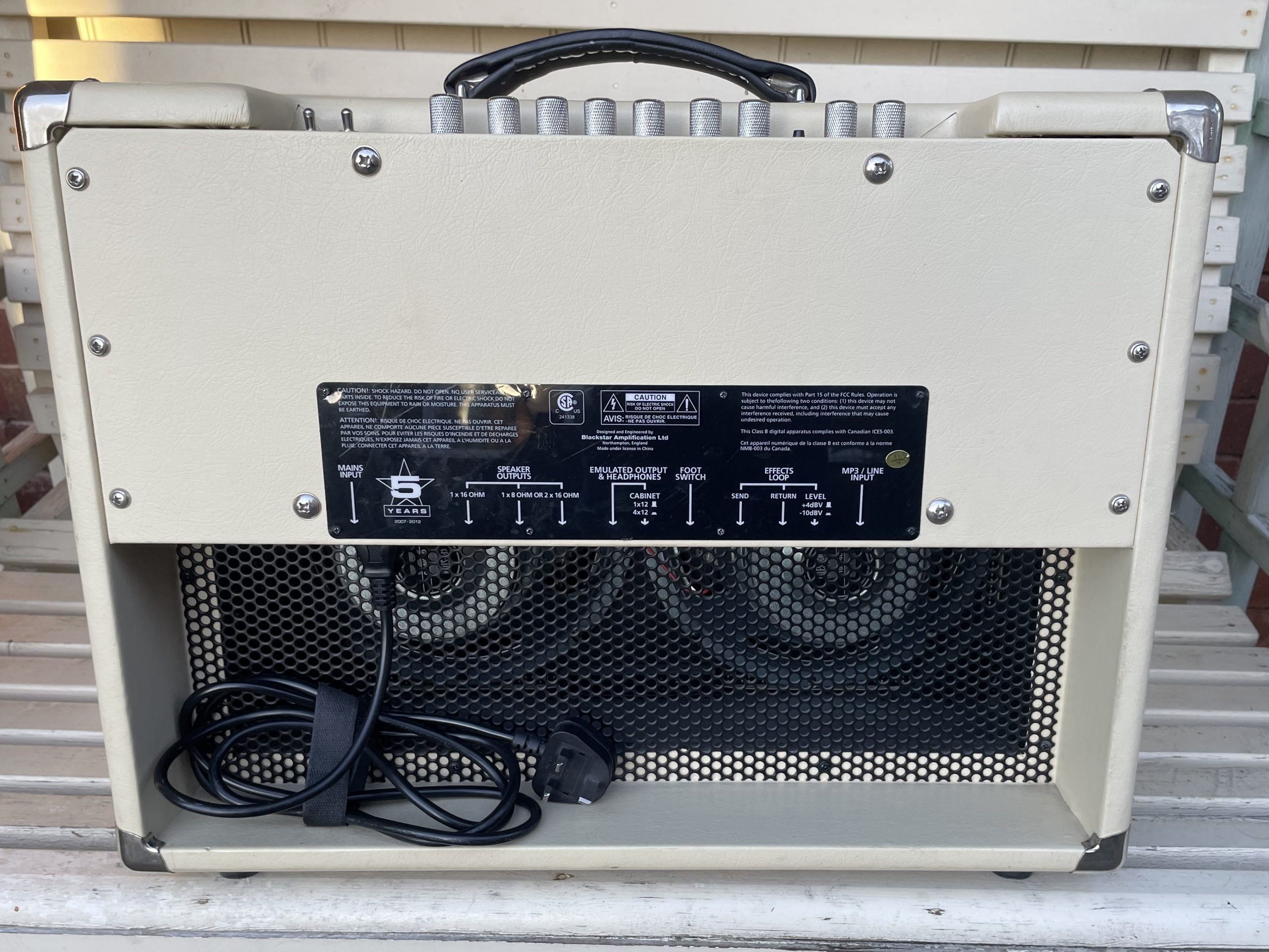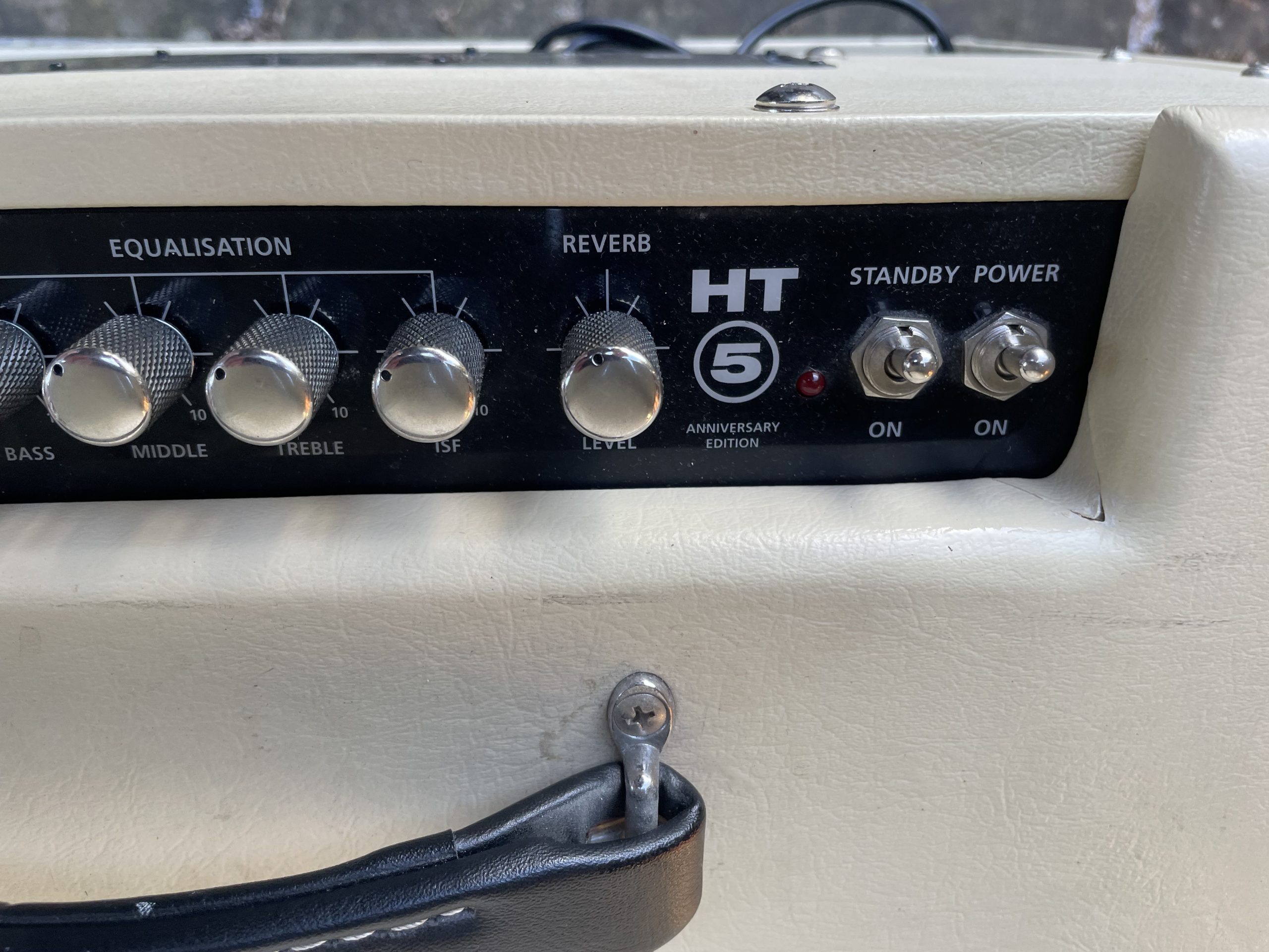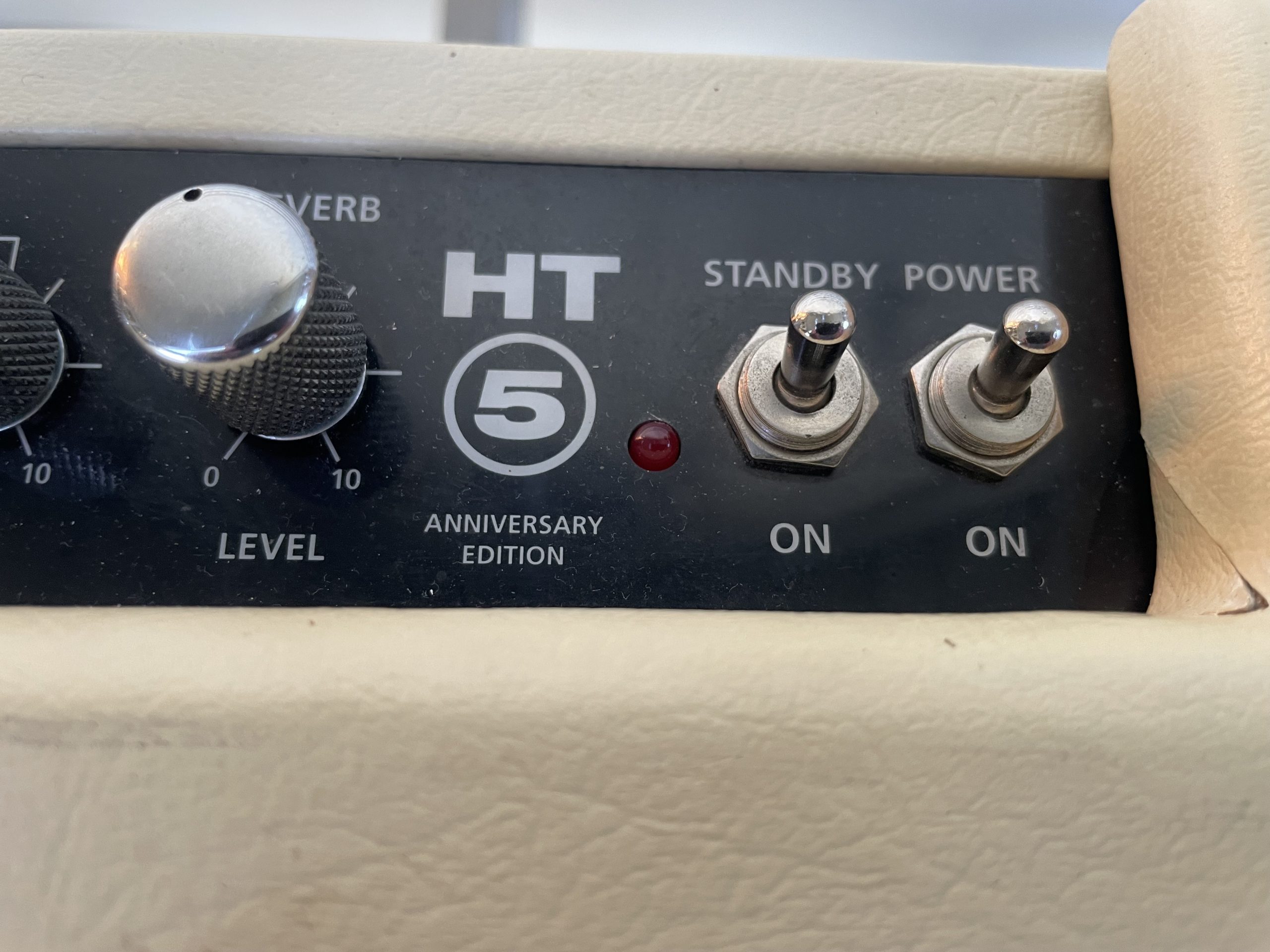 The new 2×10 combo amp features custom cosmetics including cream covering, paired with custom colored grille cloth. The chassis top panel is marked as an HT-5 Anniversary Edition, and the 5th Anniversary logo is featured on the back. Only 2,500 units will be available worldwide.