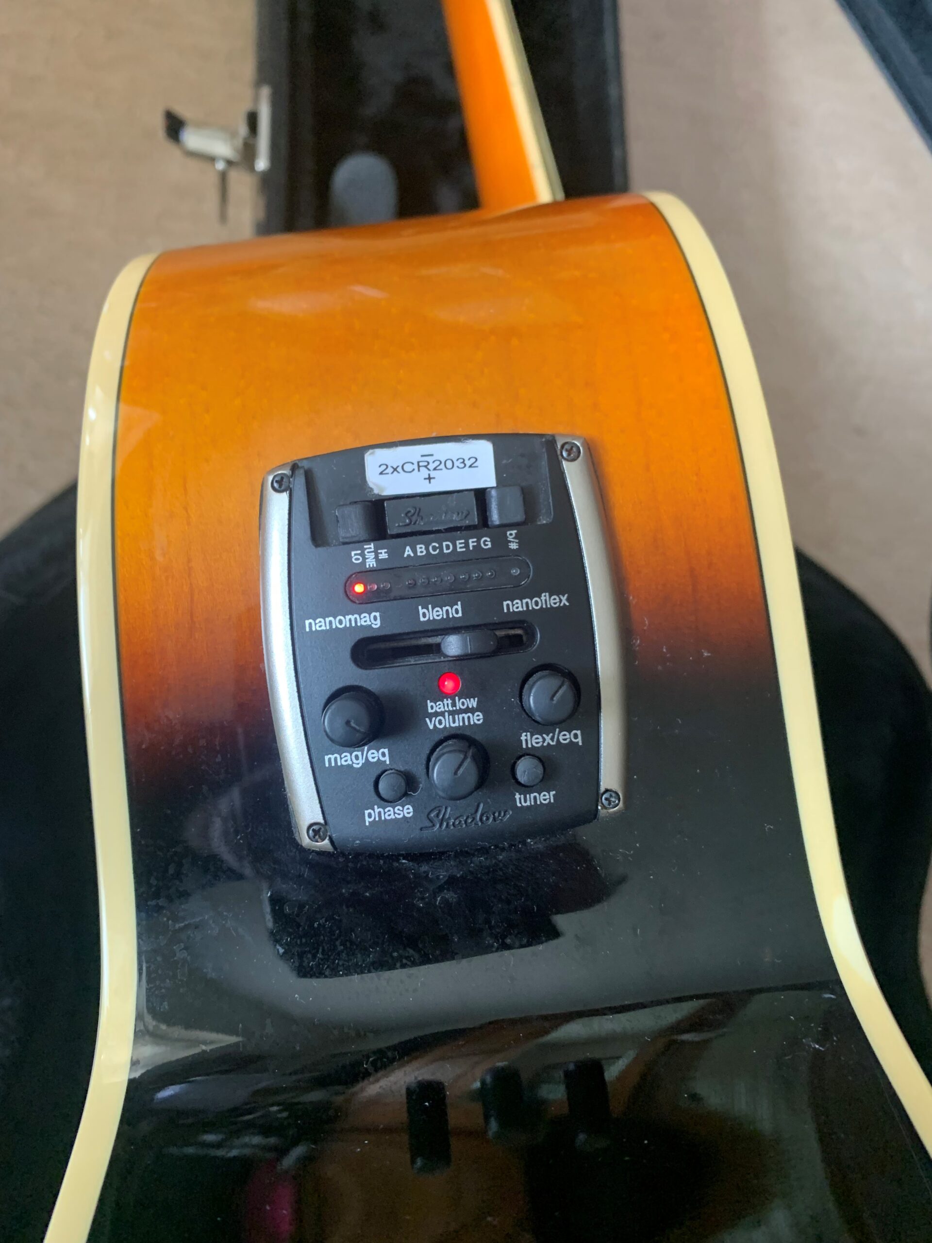 • Controls: Built-in Tuner, Master Volume, Master Tone, Phase, Treble, Bass, EQ Shape, Low battery indicator, Tuner On/Off/Mute
