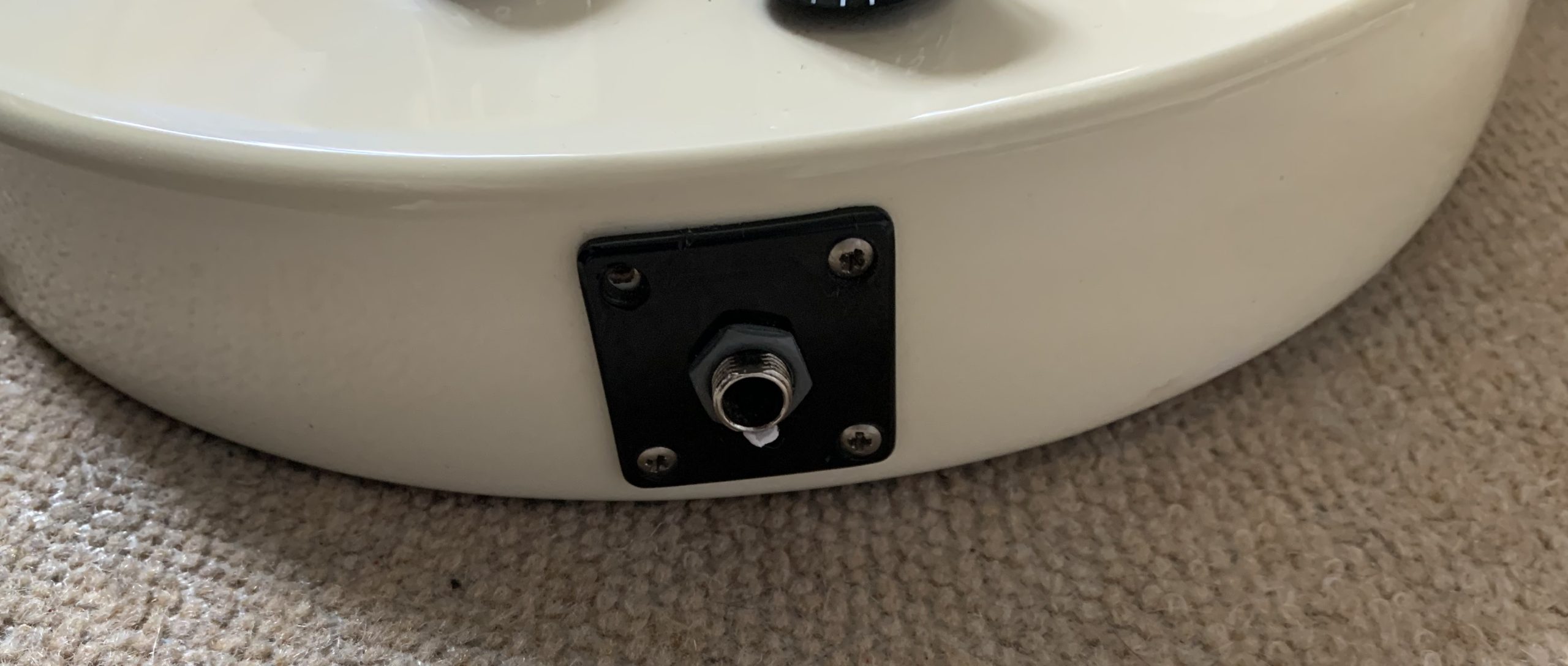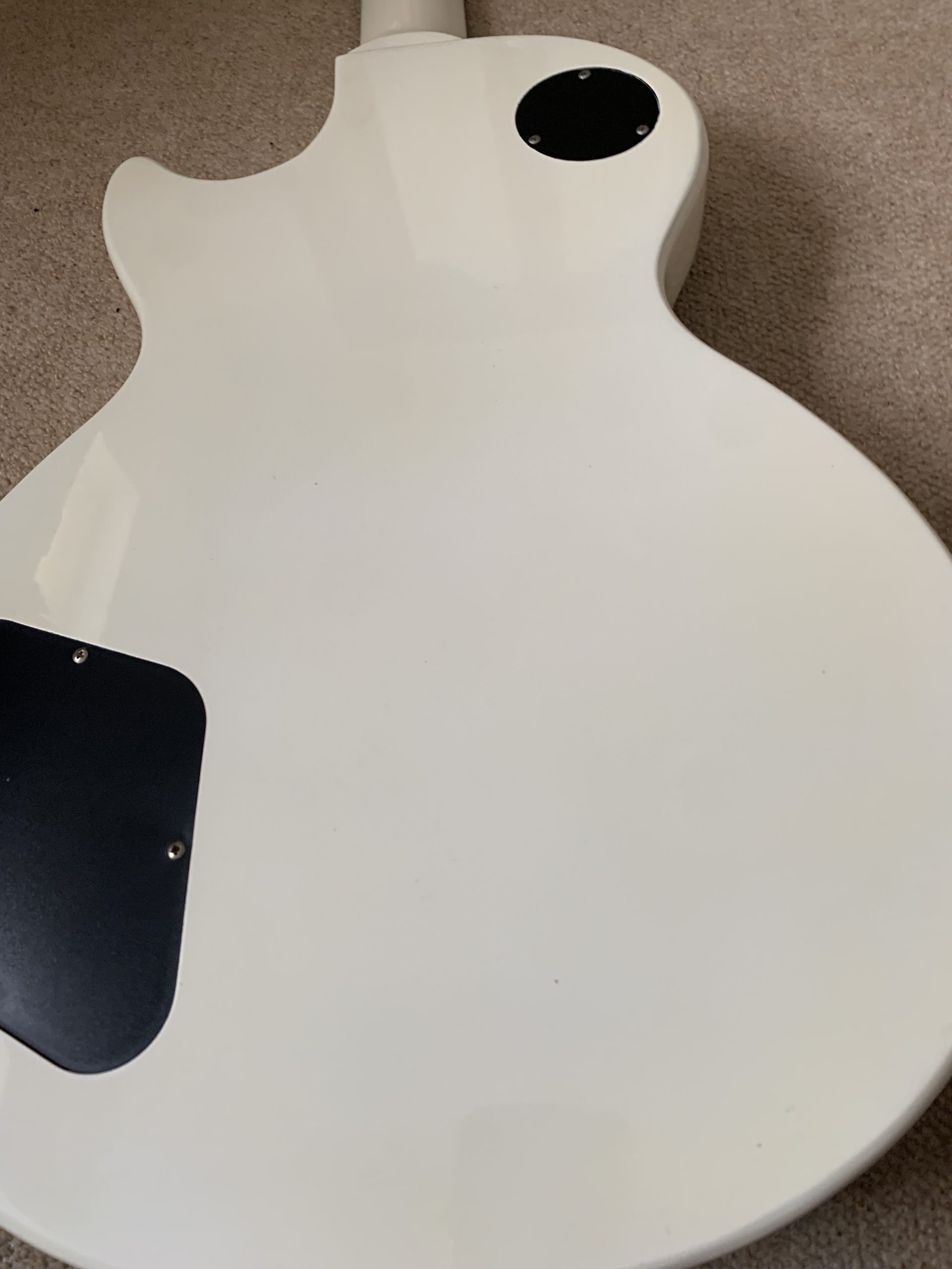 Solid body Les Paul with arched top, gloss white finish and black pickguard.