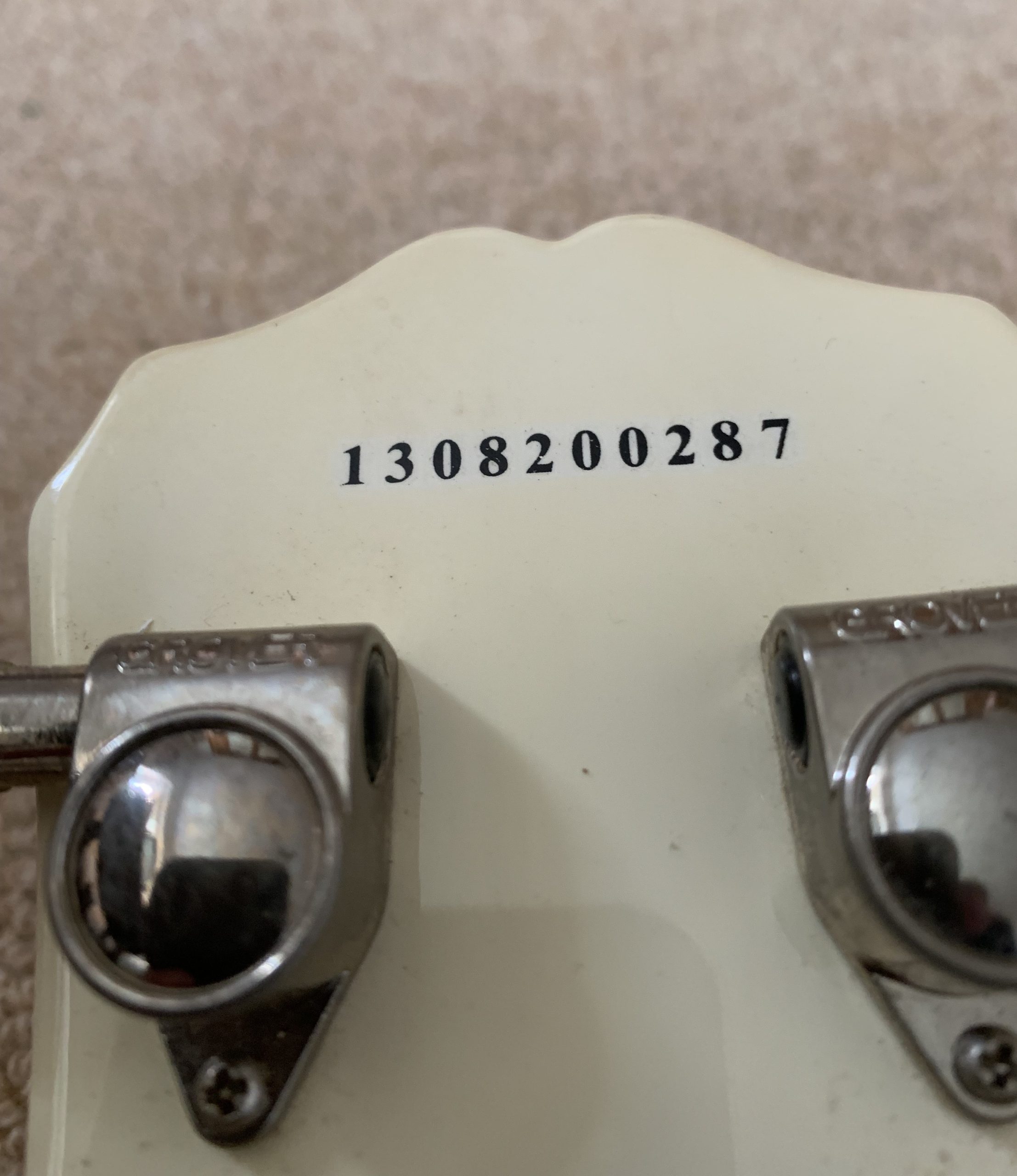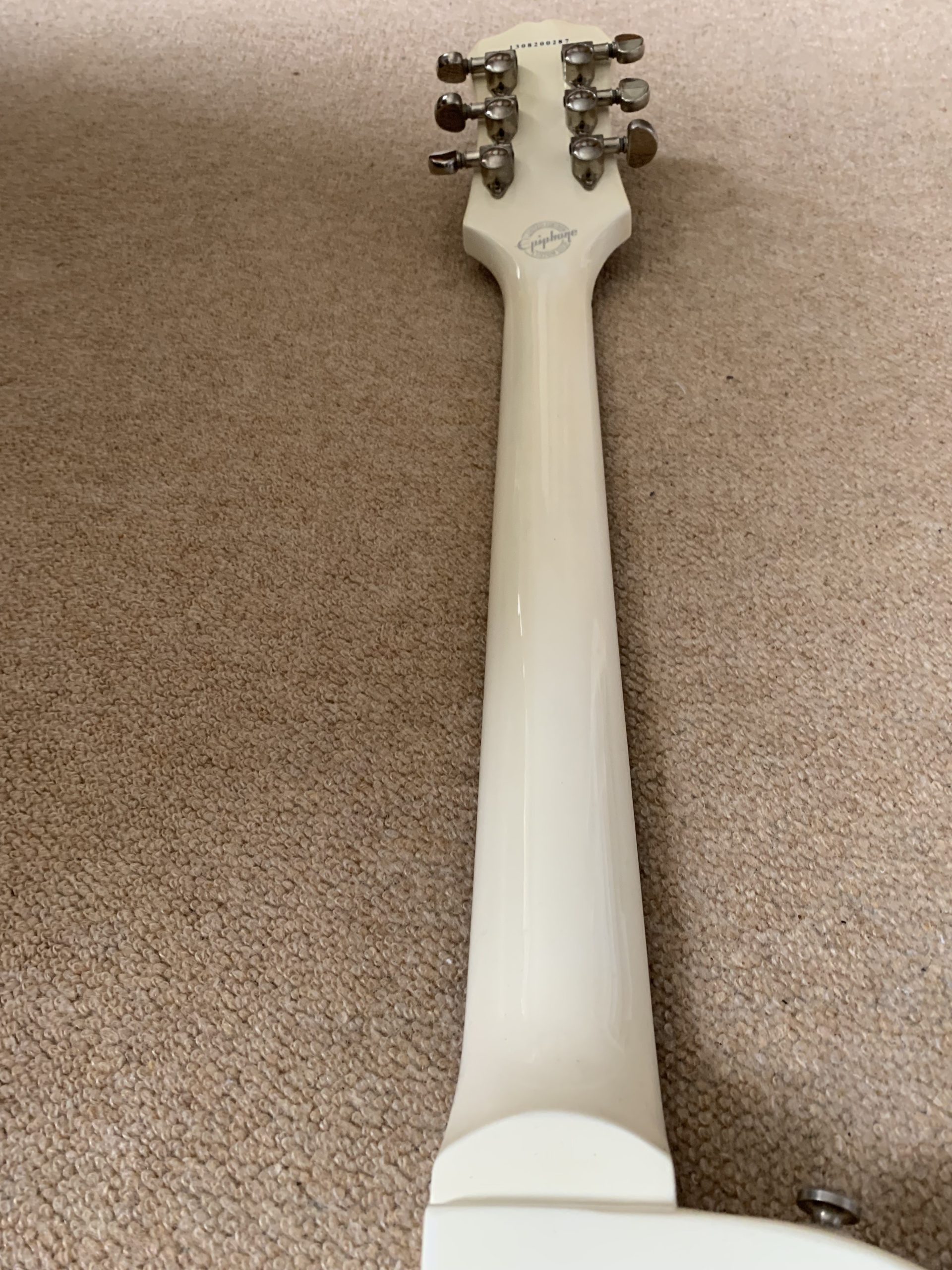 Neck: 24.75” scale length mahogany neck with matching white finish, unbound rosewood fingerboard, dot inlays, 1 11/16” nut width.