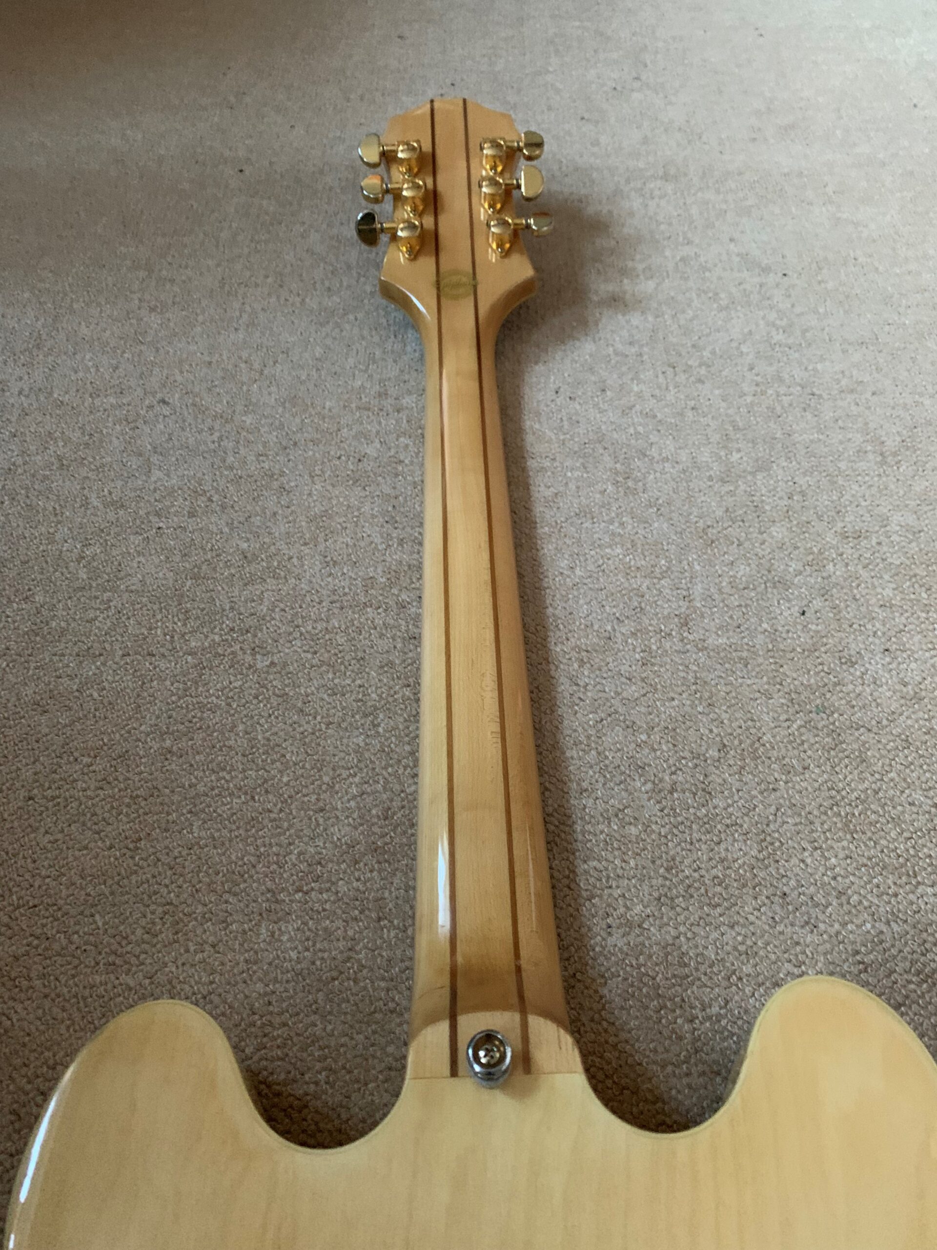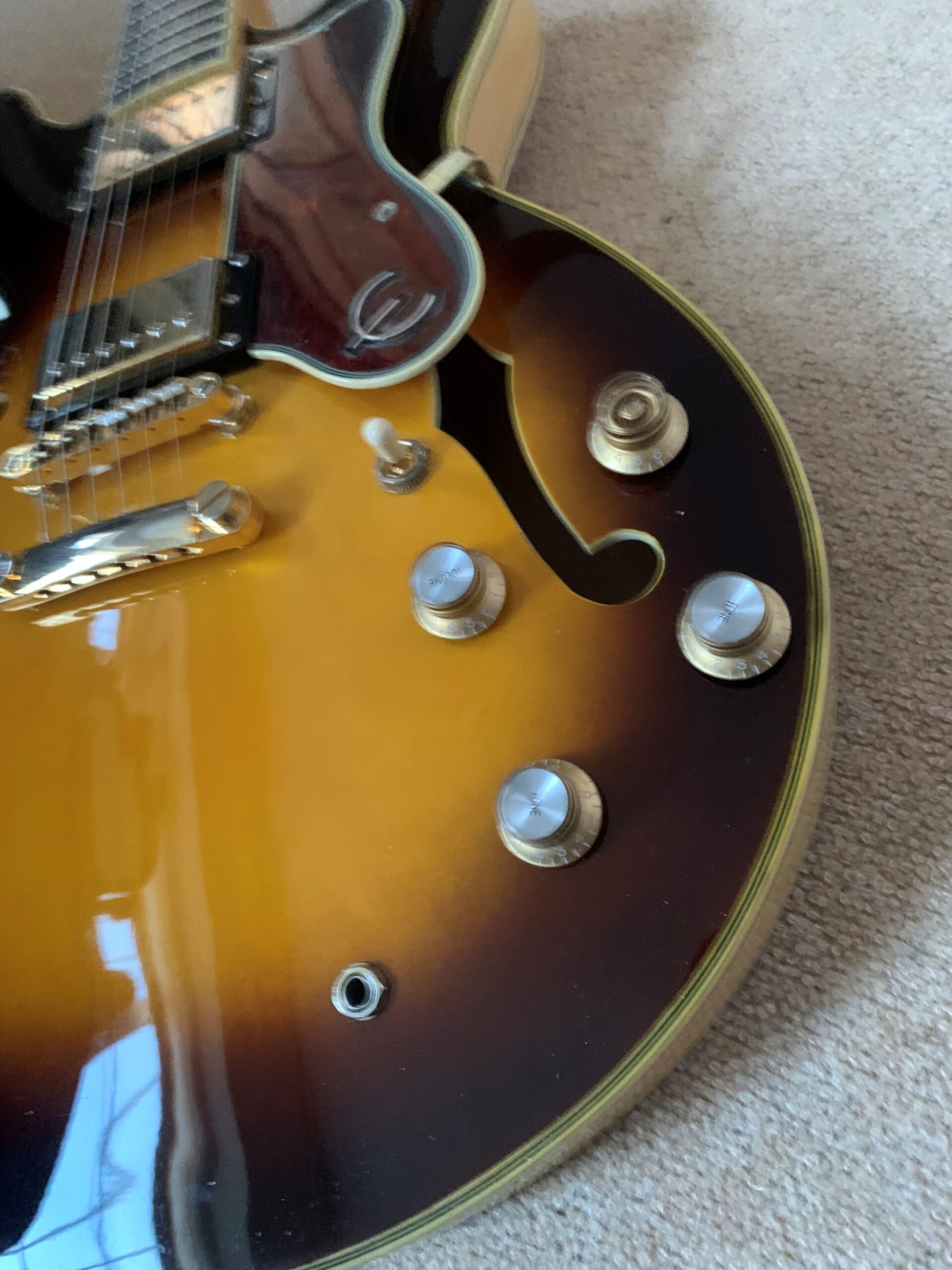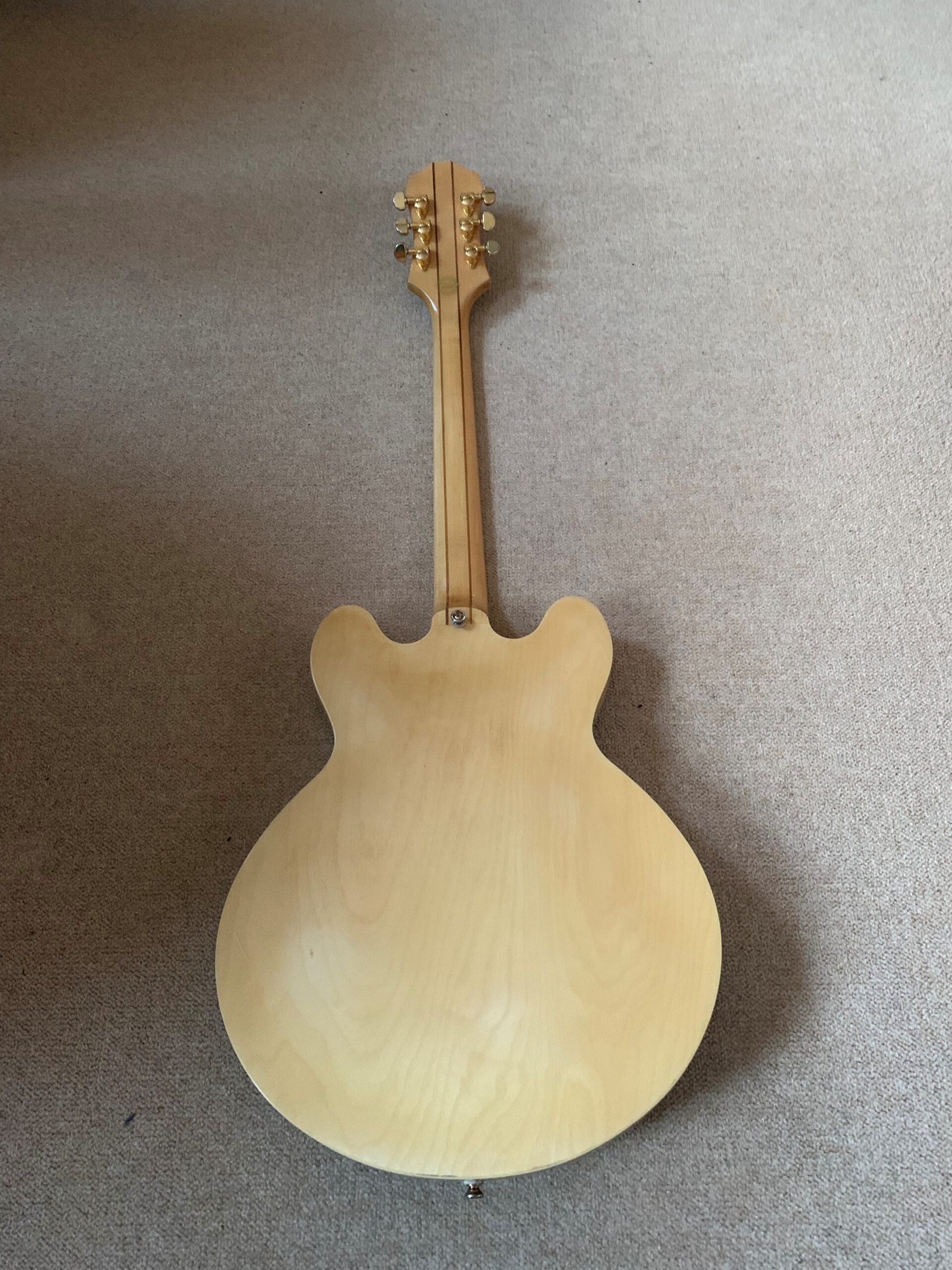 ‘The Log’ was made from Epiphone parts with a 4 x 4 inch piece of Pinewood down the middle. The ES-series is also semi-hollow with a solid centre, which makes it more resistant to feedback than a typical archtop guitar.