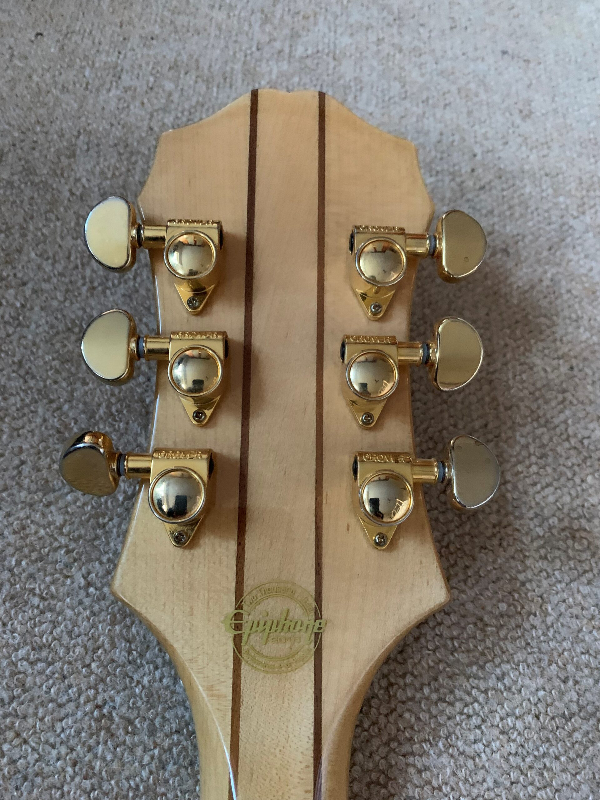 The 24.75 inch scale neck is hand-set and made of 5-piece laminated hard Maple/Walnut with a fingerboard with block and triangle pearloid and abalone inlays, 22 medium jumbo frets, and a large vintage style ‘Clipped Ear’ headstock with the classic ‘tree of life’ motif. The Epiphone Sheraton-II PRO also now comes with the new Graphtech® NuBone XL™ nut that is as hard as bone but will last a lifetime without chipping or cracking. Graphtech moulds and engineers each NuBone XL™ nut for consistent tone and string balance as well as precise string spacing.