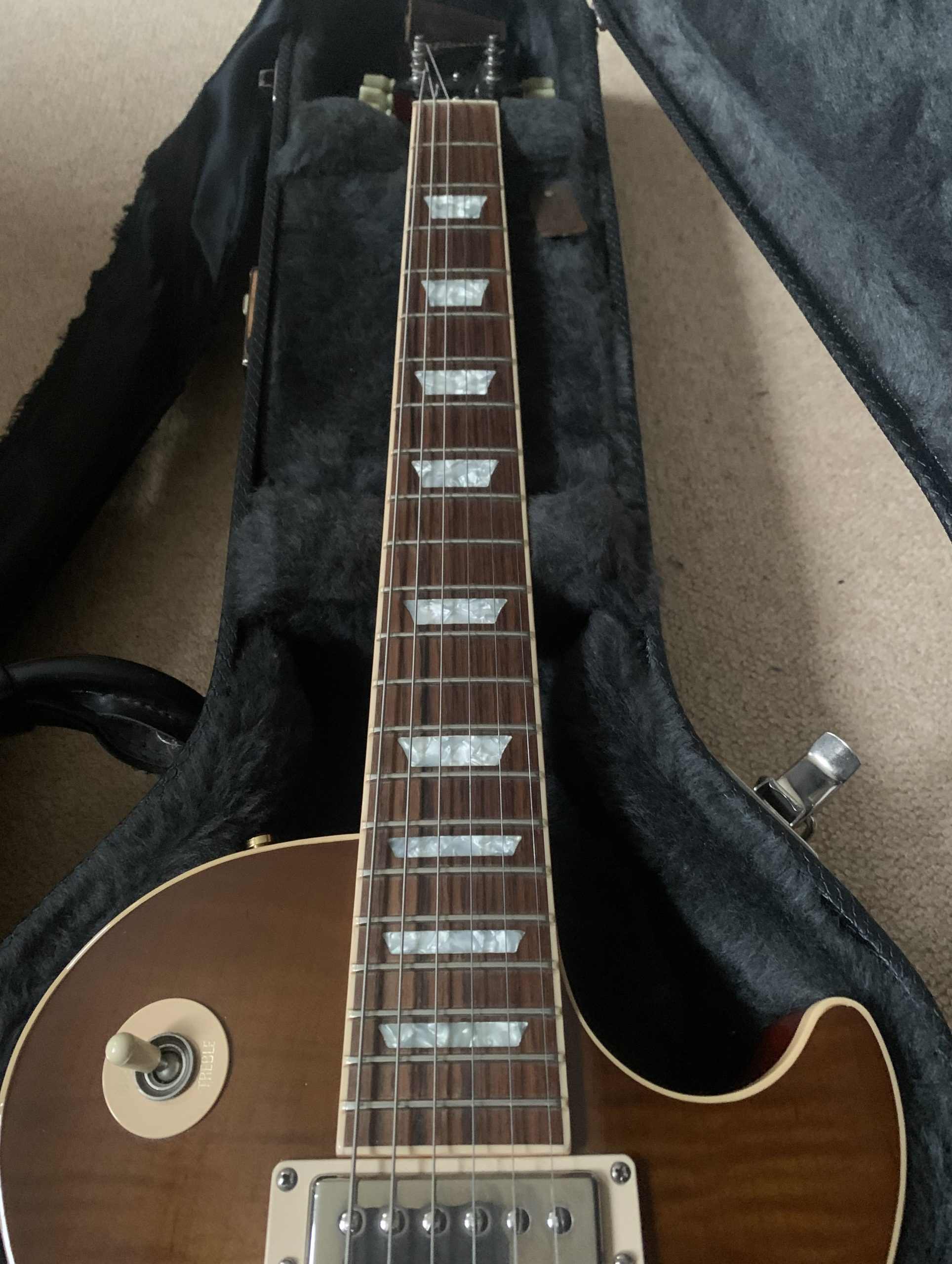 Gibson Les Paul Standard Honey Burst (2004) Great tiger flamed top Some small player marks but nothing major A little belt buckle on the back Original case Fantastic sounding Guitar plays well with low action and optimal neck relief. Frets are medium width and tall, showing no wear. Original hardware Weight:…Read More