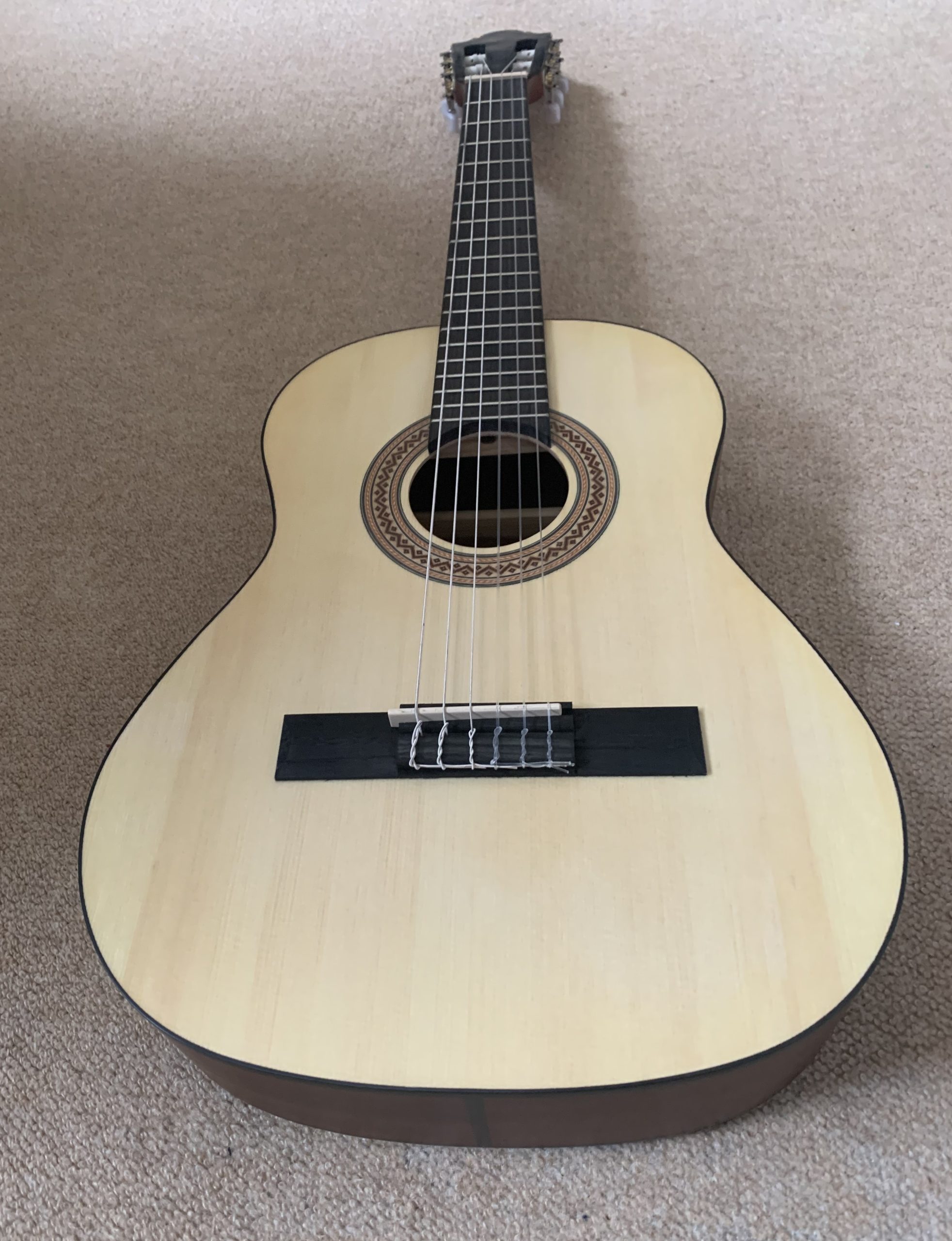 Santos Martinez SM120 Principante Classic Guitar - Natural Open Pore 1/2 Size Has had a neck repair hence price- All Good now except the scar(plays Great) - see photos – it is very strong and doesn’t affect the playability Designed for the more serious young beginner, Principante features a comfortable…Read More