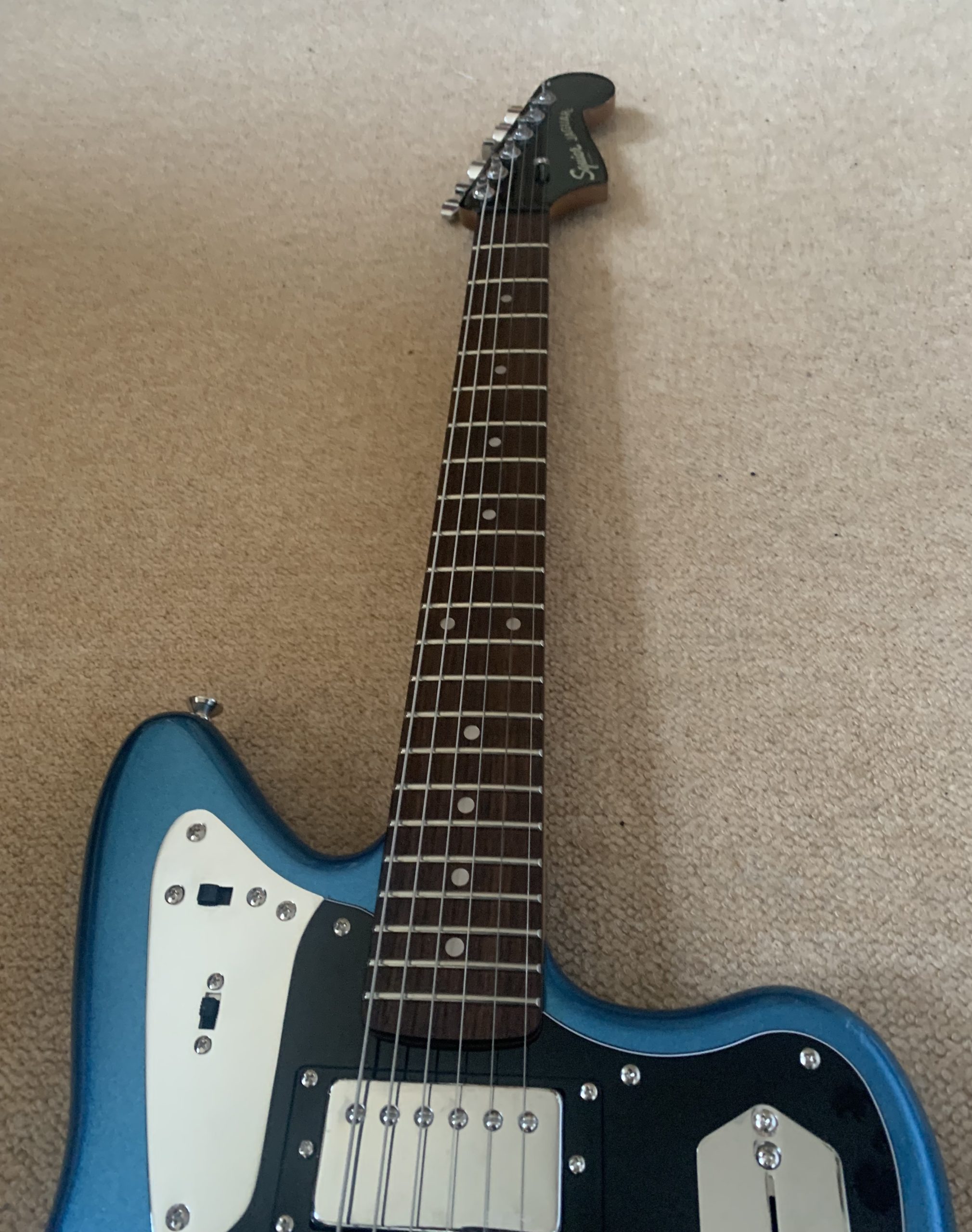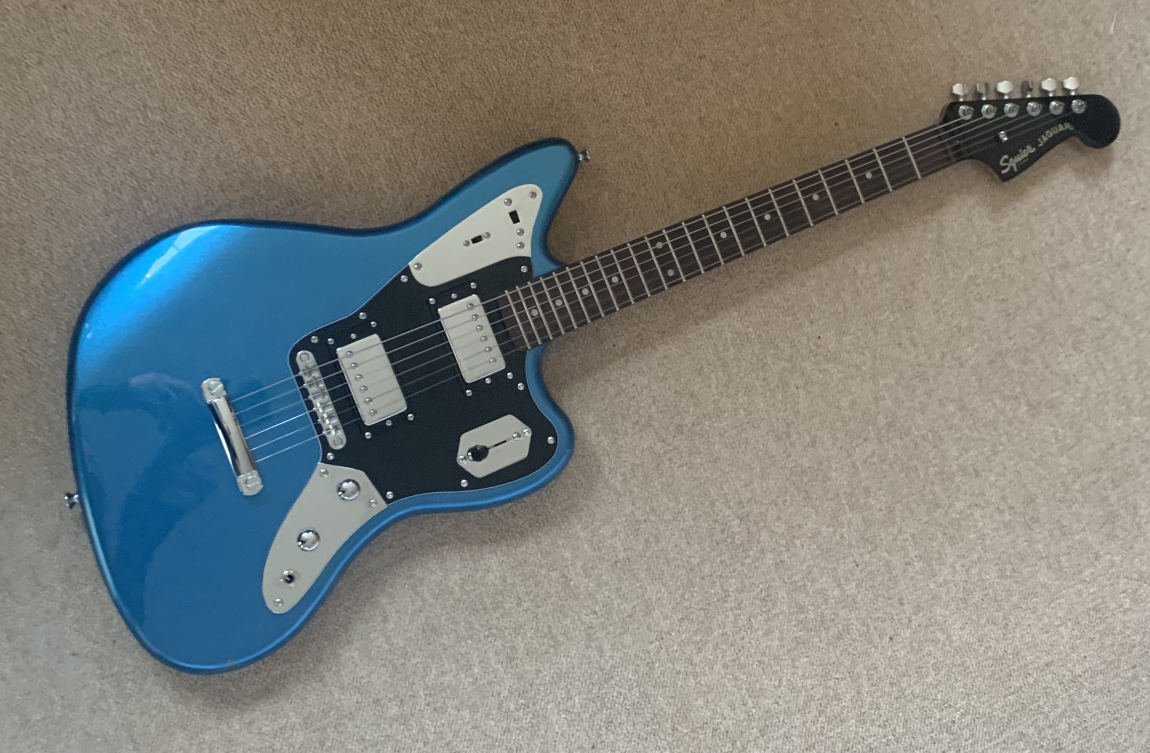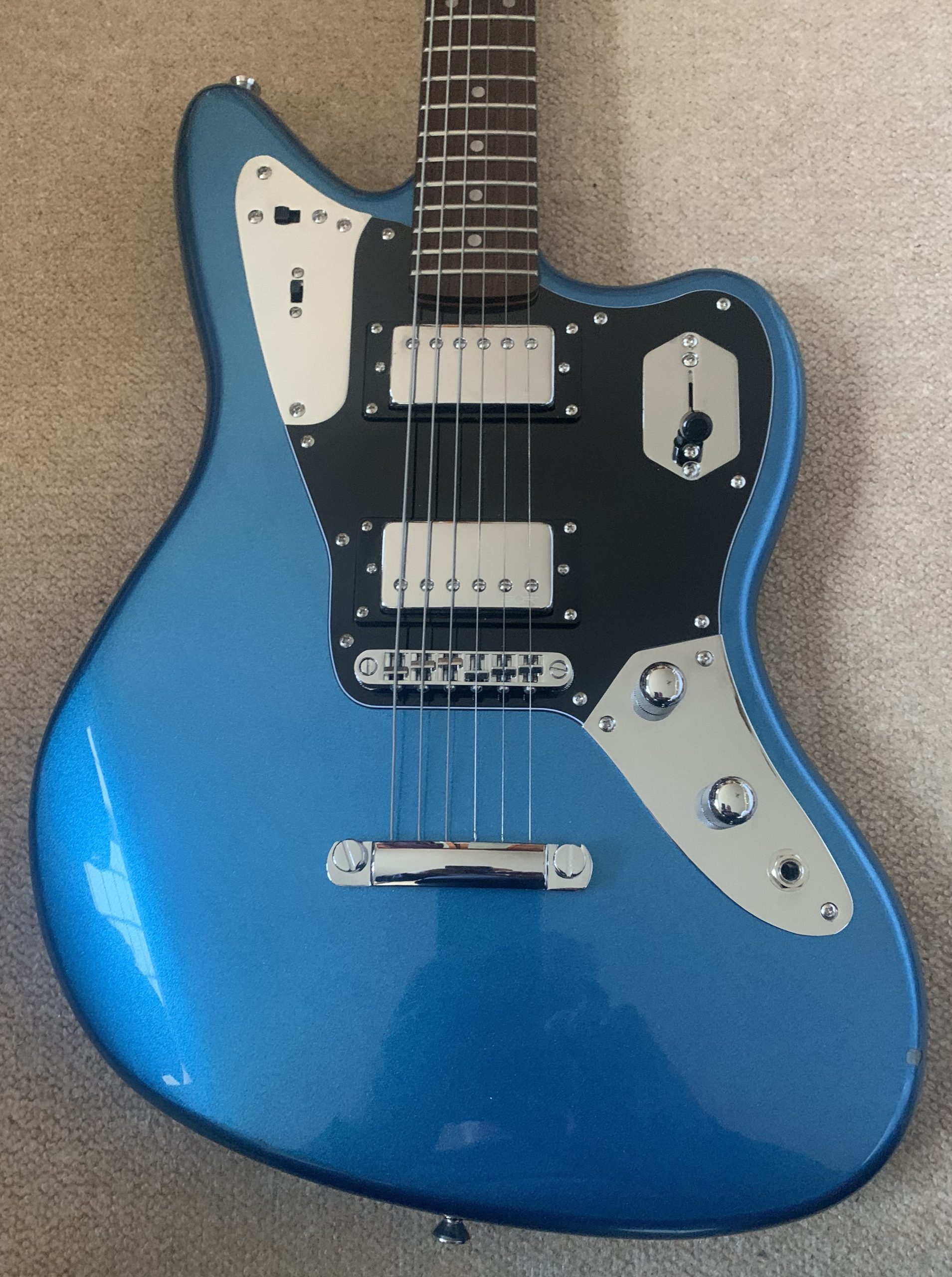 Squier FSR Contemporary Jaguar HH ST Lake Placid Blue In great condition- one small chip underneath the body and some small player marks Comes with a gigbag The Squier Contemporary Jaguar HH ST brings modern features to Fender's iconic design. With a sensible bridge! At the heart of this guitar…Read More