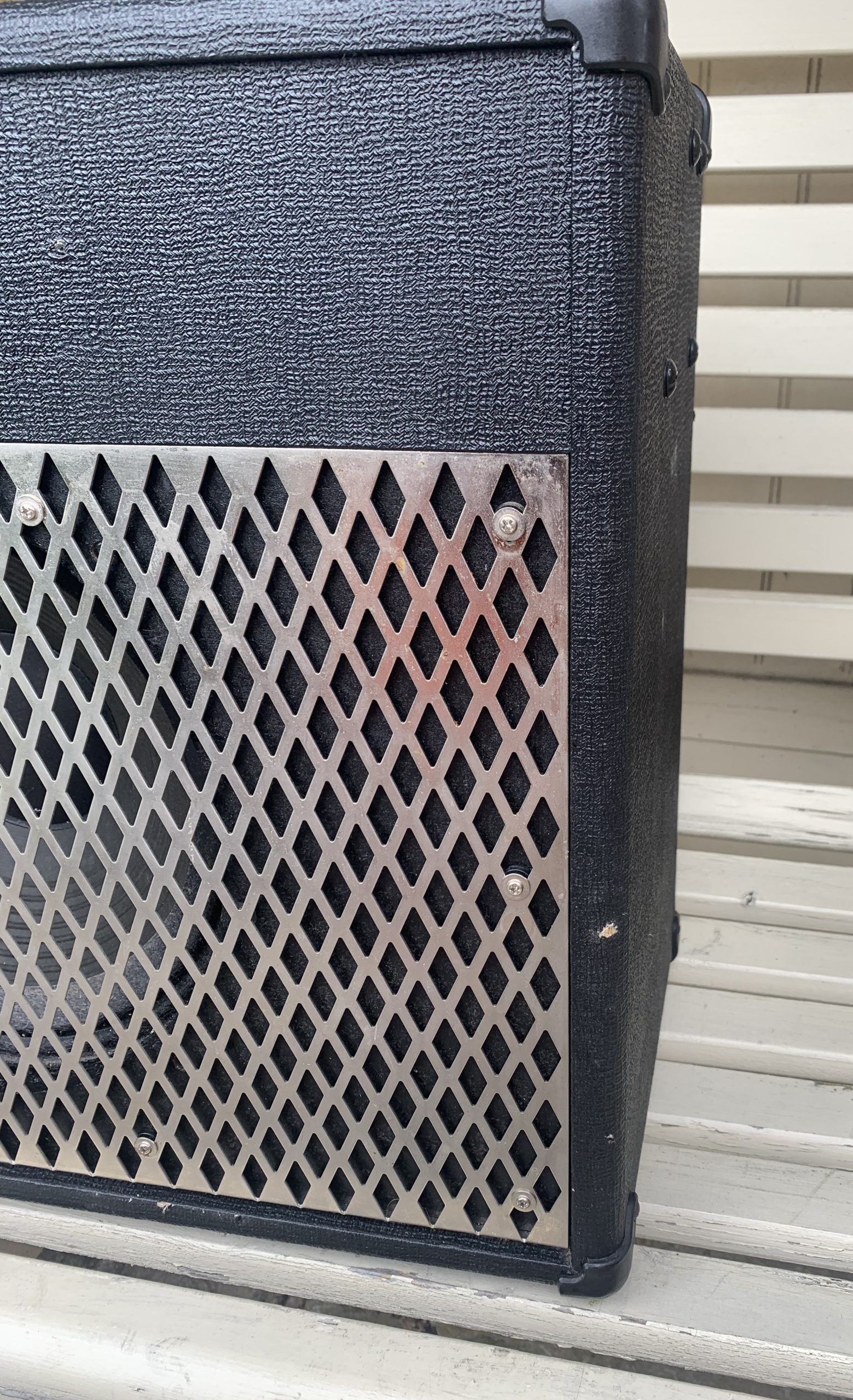 Valvetronix “Chrome” series of amplifiers. It featured one 12″ Celestion 70-80 speaker in a closed back, pressed board cabinet powered by a 50 watt Valvetronix amplifier circuit. The control panel was loaded with controls for eleven amp models, eleven pedal effects and a two channel digital programmer.